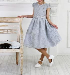 光沢のある生地をベースに、花柄総レースの同色生地を重ねたジュニアのパーティドレス。